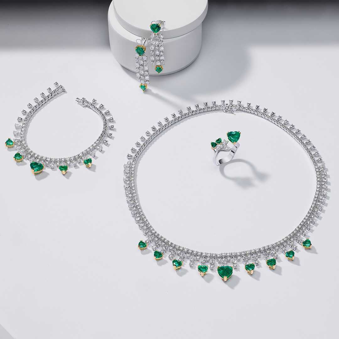 طقم زفاف مرصّع بالألماس مع حجر الزمرد